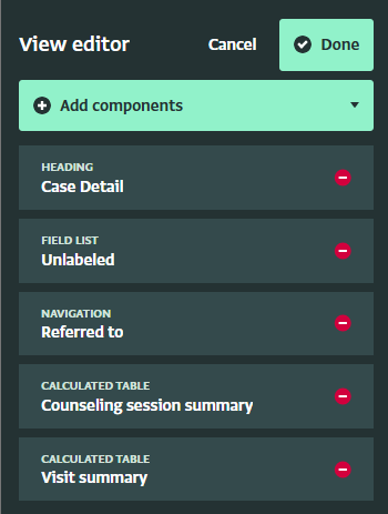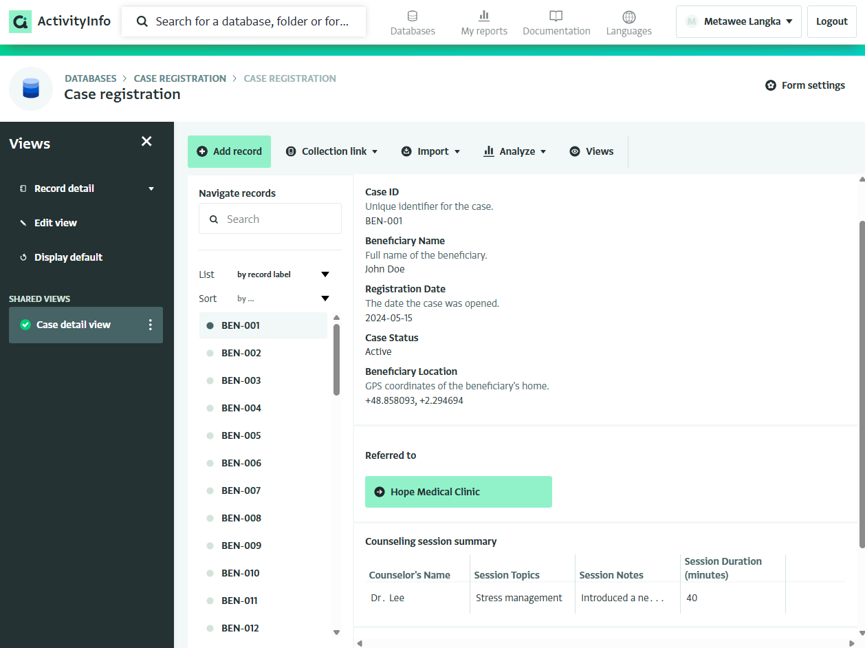 You can now create a Record Detail View that brings all the details of a record onto a single page. This feature supports use cases such as case management, where a case manager may need to review beneficiary records along with related subrecords, such as interventions, alongside key information like name, date of birth, and other details. You can add direct navigation to related subrecords or reference records, which can open another detail view with critical information about the related intervention, for instance.