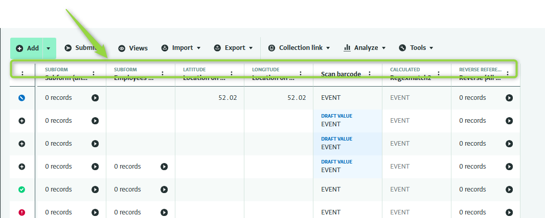 Indicating calculated fields, geographic, subforms and reverse reference fields in the column header