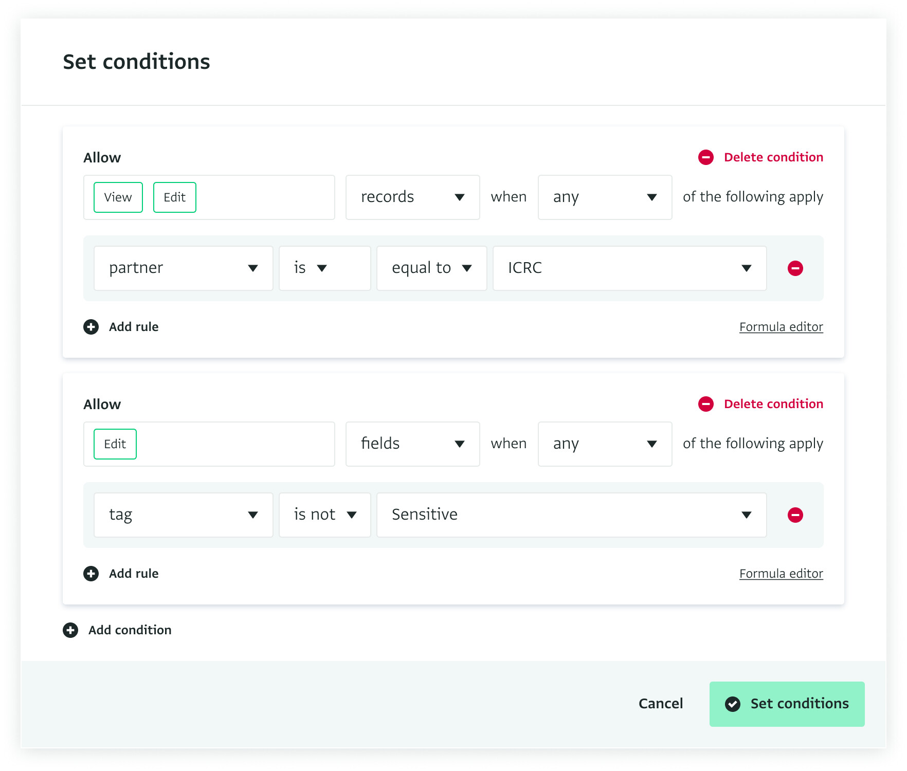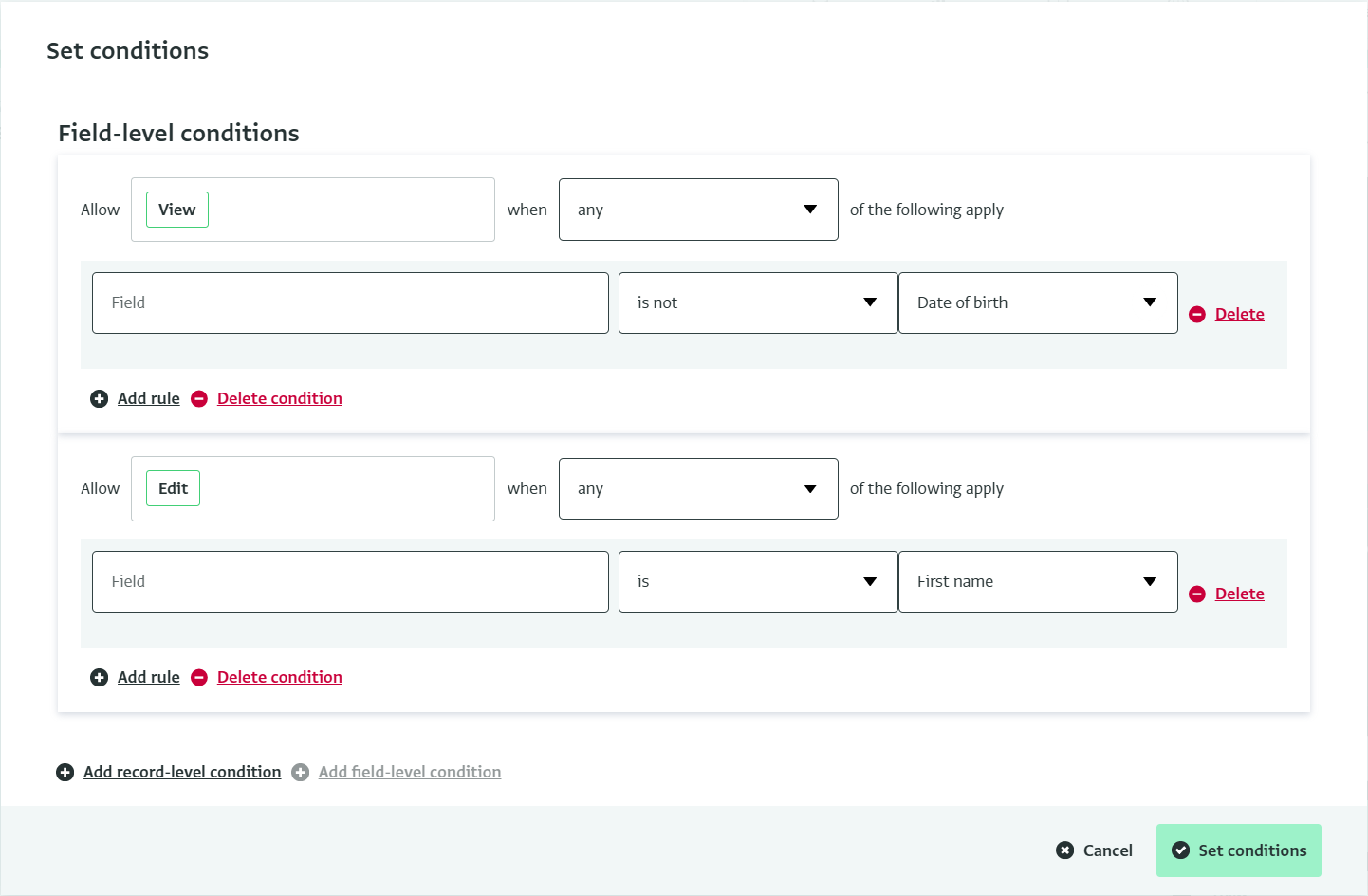 We haven’t seen a compelling use case for combining record-level conditions with field level conditions. (For example, allowing only access to incident narrative text when Province = “North”) so we are planning to keep record-level and field-level conditions seperate. Are we missing a need here?