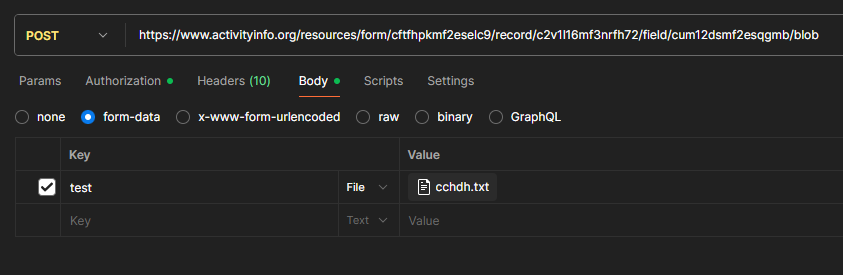 The required mime type is multipart/form-data and the endpoint expects two parts: